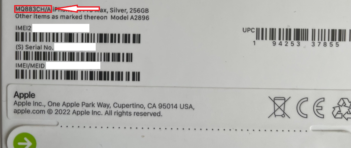Вам необходимо посмотреть маркировку модели iPhone на обратной стороне коробки и сравнить ее с нашей таблицей. В данном случае (на фото) нам нужны буквы CH. Смотрим таблицу и видим, что этот iPhone 14 Pro Max предназначен для КНР.